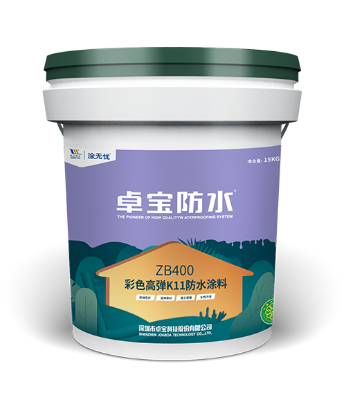 ZB400 彩色高弹K11防水涂料是一款双组分柔性防水涂料。该产品采用优质改性丙烯酸酯聚合物乳液、波特兰水泥以及精选添加剂按科学配比配制而成。有机乳液与无机粉料混合后,发生的化学反应能形成坚韧的弹性防水膜,持久有效防水。