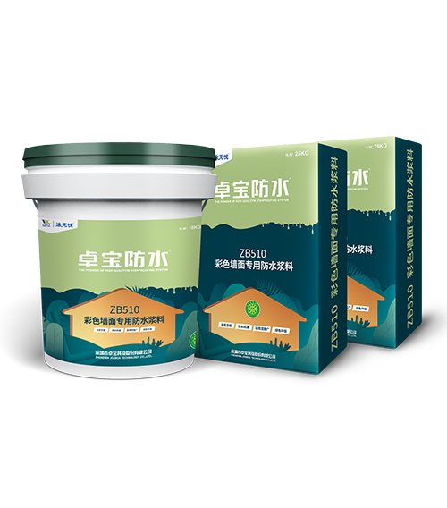 ZB510彩色墙面专用防水浆料是一款双组分刚性防水浆料。该产品由高分子丁苯复合乳液、特种水泥以及富含多种添加剂的粉料按照科学配比配制而成;施工成膜后形成的坚韧涂层,有效持久防水。