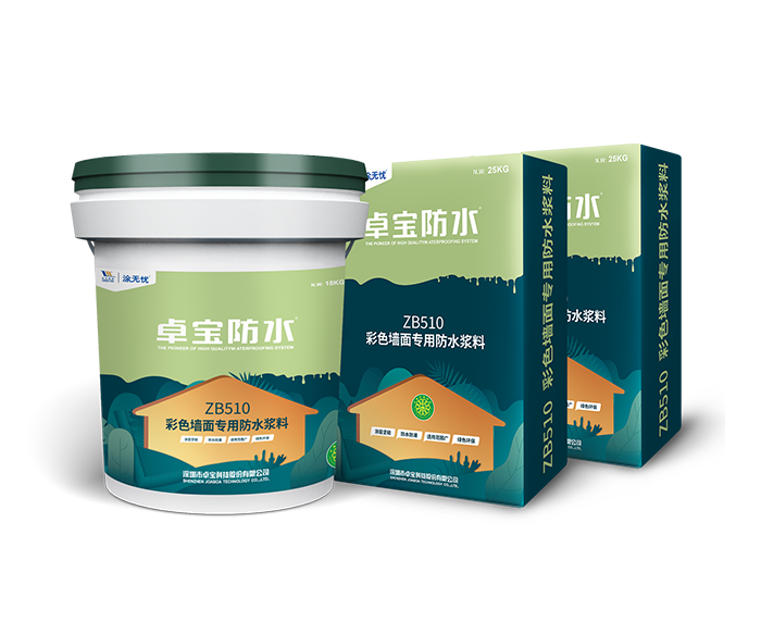 ZB510彩色墙面专用防水浆料是一款双组分刚性防水浆料。该产品由高分子丁苯复合乳液、特种水泥以及富含多种添加剂的粉料按照科学配比配制而成;施工成膜后形成的坚韧涂层,有效持久防水。