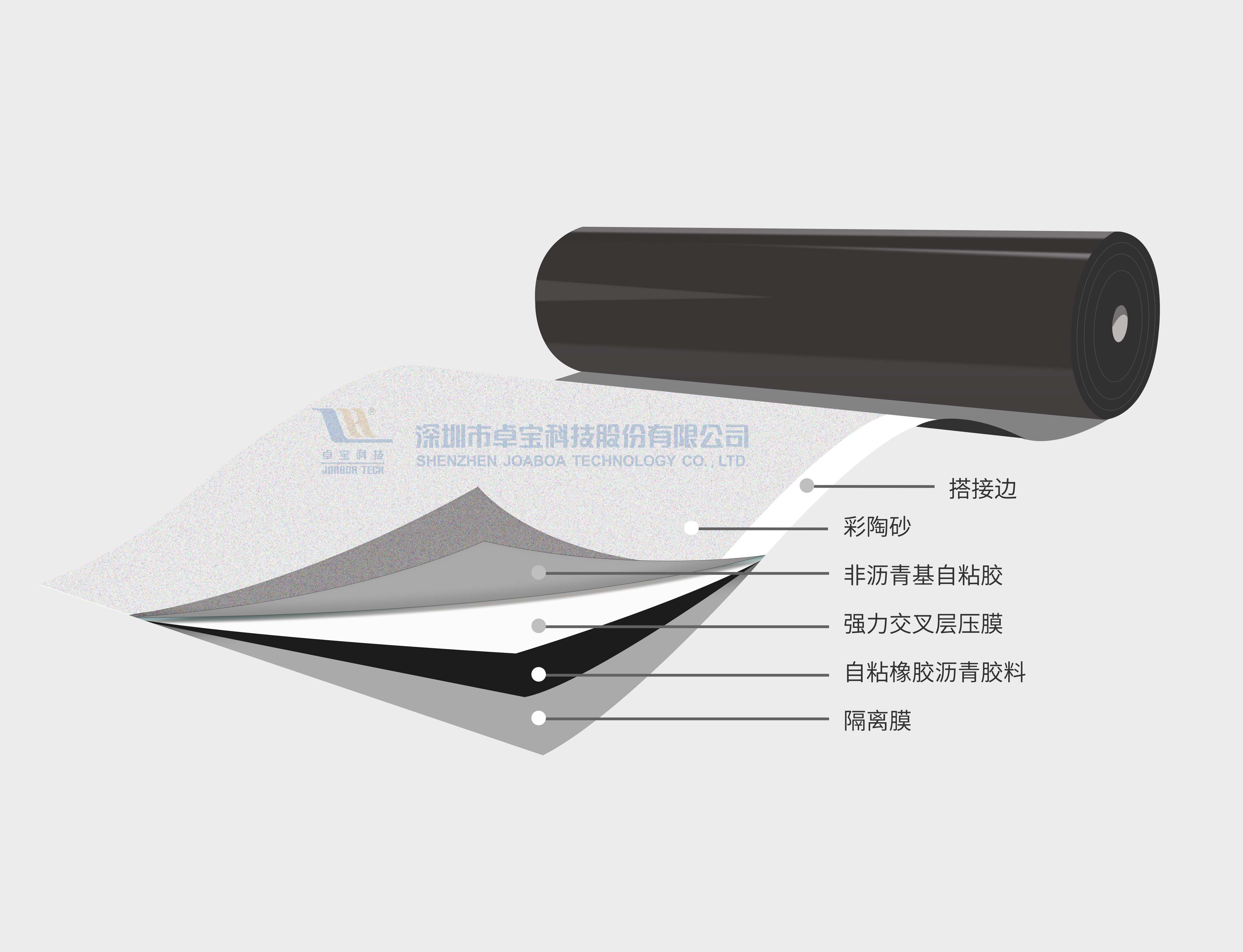 该卷材是一种由强力交叉层压膜、高性能配方的自粘橡胶沥青胶料、高分子自粘胶(非沥青基)、彩陶砂、隔离层组合而成的一款自粘型预铺反粘防水卷材。具有抗拉能力强、延伸率高、耐撕裂、施工应用性优等特点,非常适合应用于地下室底板、外防内贴的地下室侧墙、地铁、隧道以及其它预铺部位的防水工程中。